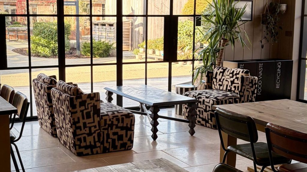 Inside, the vaulted cedar ceiling, rustic stone fireplace and gentle greenery – including our much-loved central olive tree – create a warm, inviting space. Find a cosy corner by the fire or gather with friends at one of our larger tables. We also have a small number of dog-friendly tables (subject to availability), complete with comfy beds and water bowls for four-legged guests.