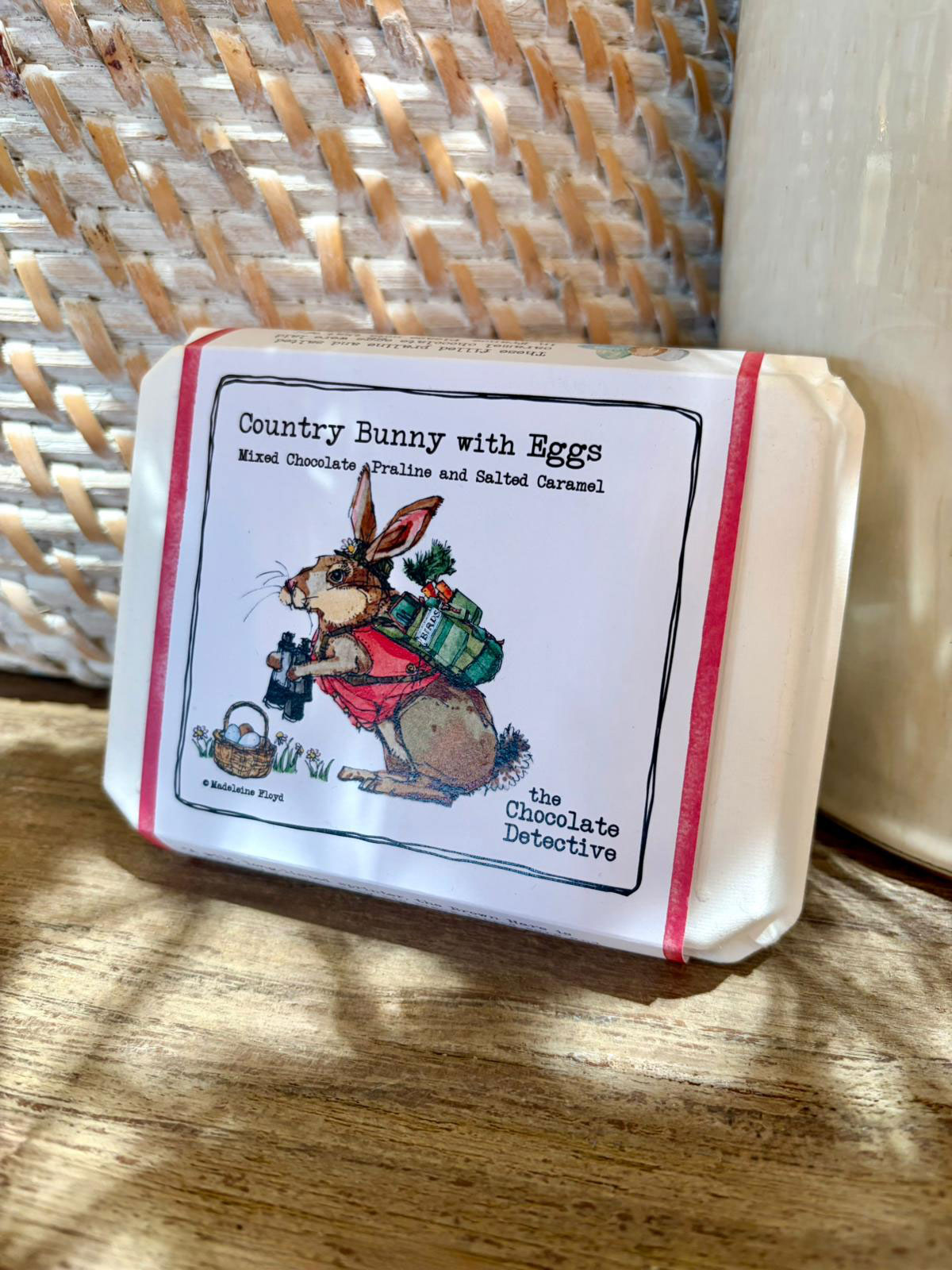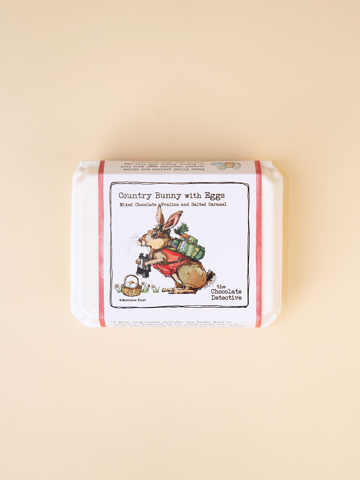 Our 12 Country Bunny eggs are a mixed box with 6 filled with salted caramel and 6 filled with hazelnut praline. Layers of dark and milk chocolate are filled with a buttery salted caramel or praline ganache, wrapped in a fine sugar shell and life-like speckles. The perfect gift for little ones or an indulgent treat for grown-ups.