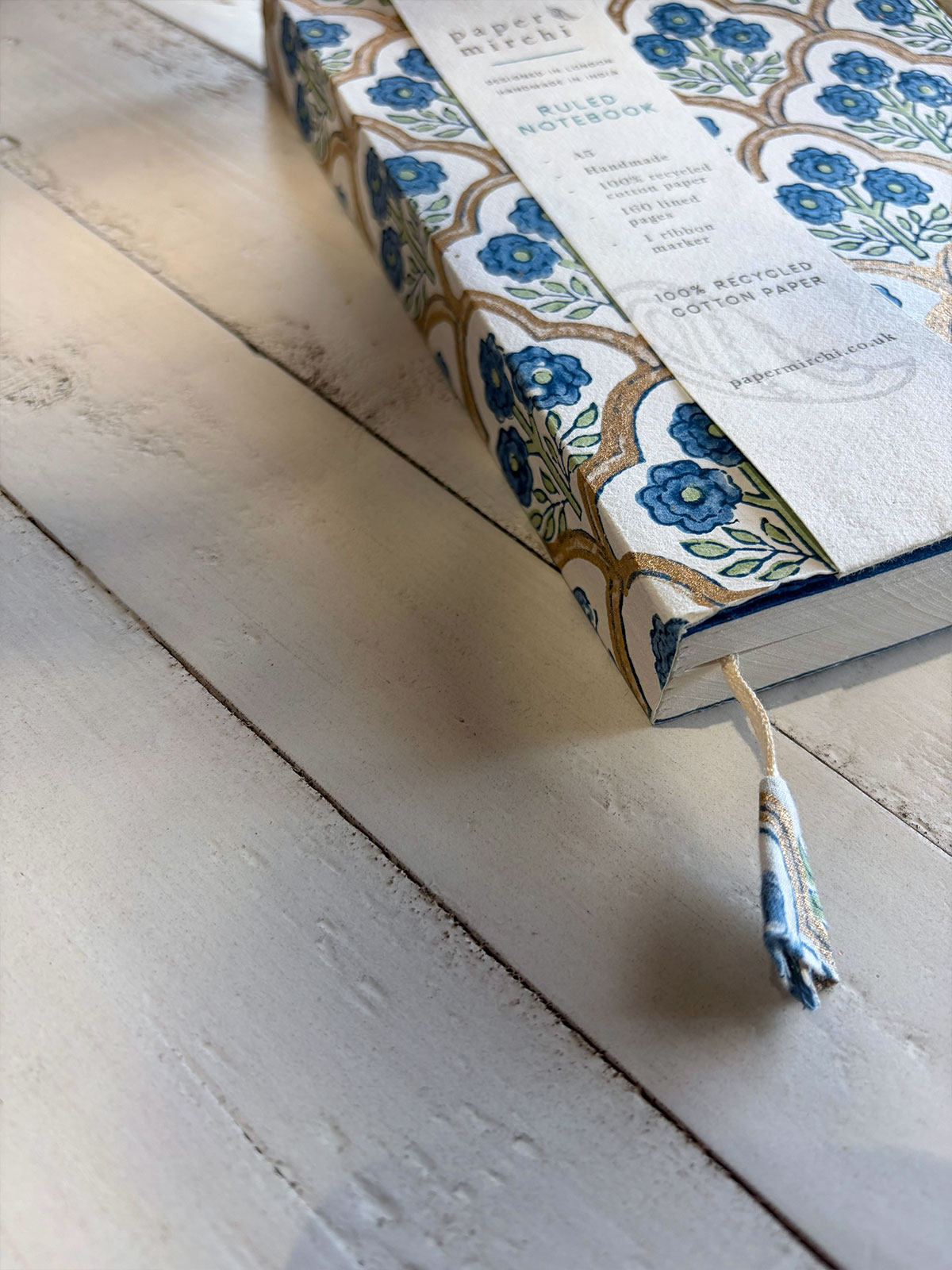The Indigo notebook is a small work of art, featuring hand block printing and beautiful soft colours. The inside pages are lined and made from recycled cotton rag paper – soft & durable with a slight texture. These notebooks are perfect for journalling or making notes.