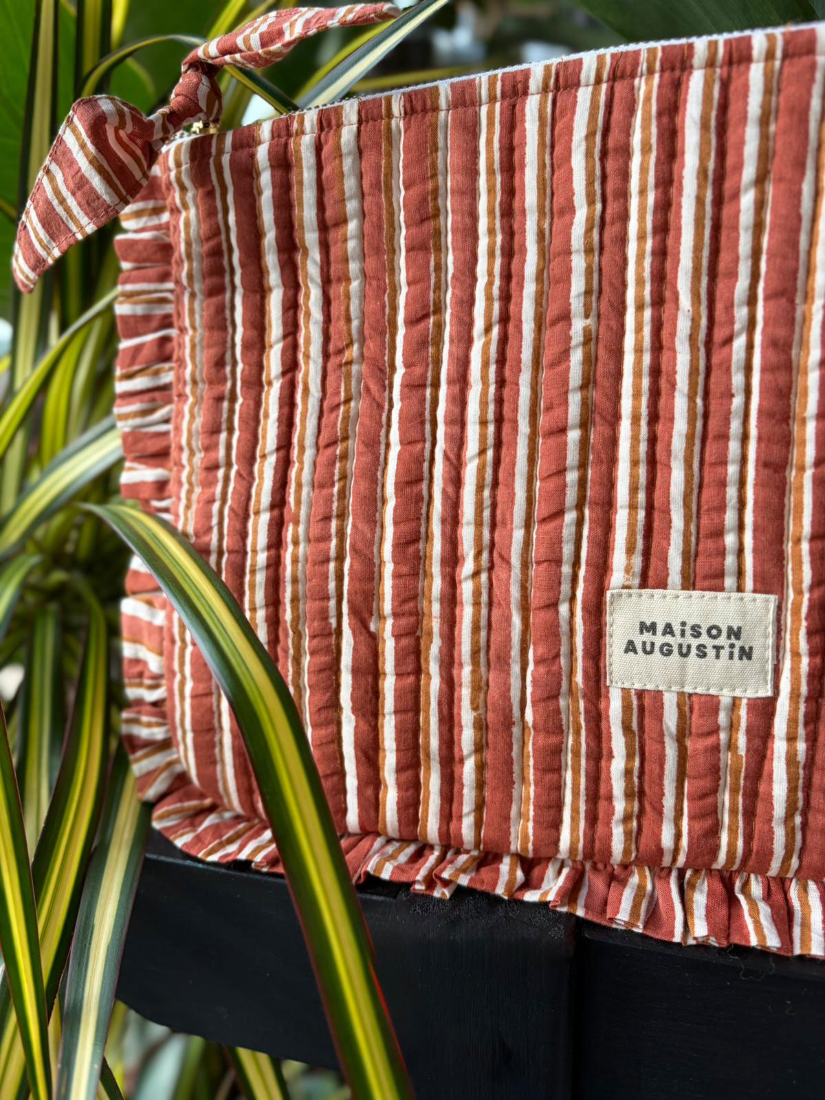 The large brown stripe pouch is perfect for keeping your everyday essentials organised. With its beautiful frills stripes this roomy pouch goes with everything.