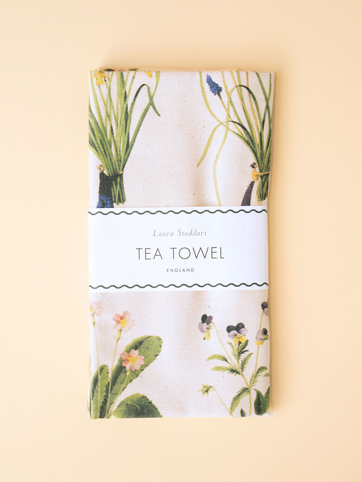 The Spring Flowers Tea Towel features a range of fresh and delicate Spring Flowers including Muscari, Primrose, Tête á Tête and Viola by renowned illustrator Laura Stoddart.