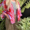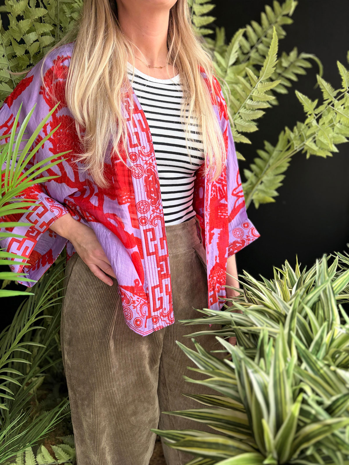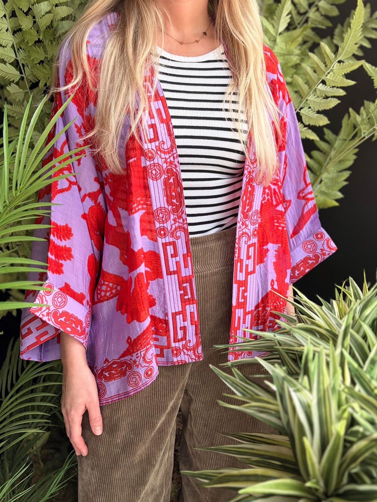 The Willow Violet Kimono features a beautiful willow design in a colourful red and violet design. These beautiful kimonos have loose 3/4 length sleeves and a lightly embroidered collar.